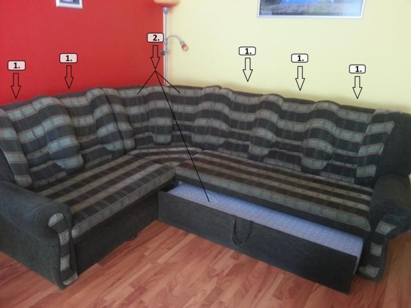 Vannak olyan bútorok, - a bal oldalon látható sarokülő garnitúrákkal ellentétben-, ahol a szövettel borított keretben külön, kivehető párnák alkotják az ülőrészt és a háttámlát.